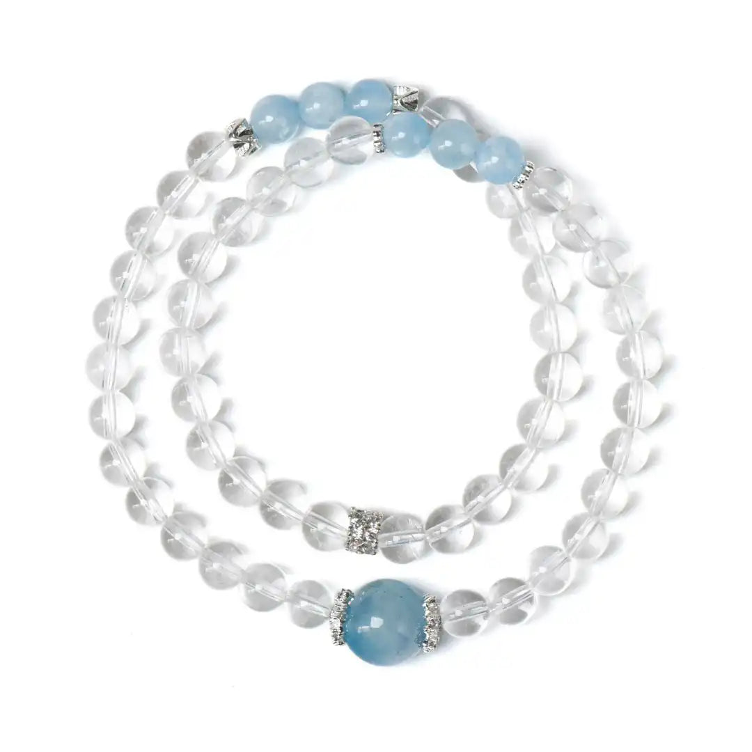 The design features AA-grade clear quartz as the main beads—clean, refined, and beautifully radiant—accented with varying sizes of clear aquamarine.