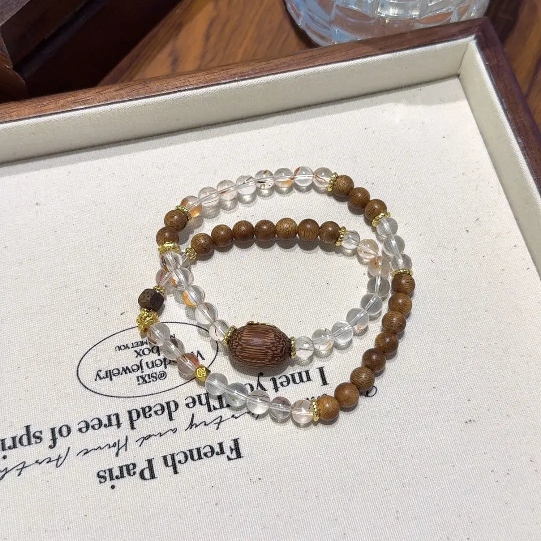 Fine 6mm Clear Quartz beads create a light, breathable foundation—transparent and spacious—while the layered tones of Agarwood draw the energy inward, grounding the overall field. Visually calm and rhythmically soft, the bracelet carries an immediate sense of quiet, helping the nervous system settle almost at first glance.