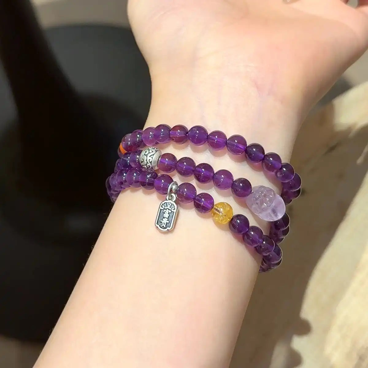 This multi-wrap bracelet is centered around amethyst, complemented by nanhong agate spacers and warm citrine crystal accents for a refined yet powerful energy profile. The golden glow of the citrine crystal brightens the whole piece, elevating its abundance frequency, while the red nanhong agate adds a symbolic touch of luck and vitality.