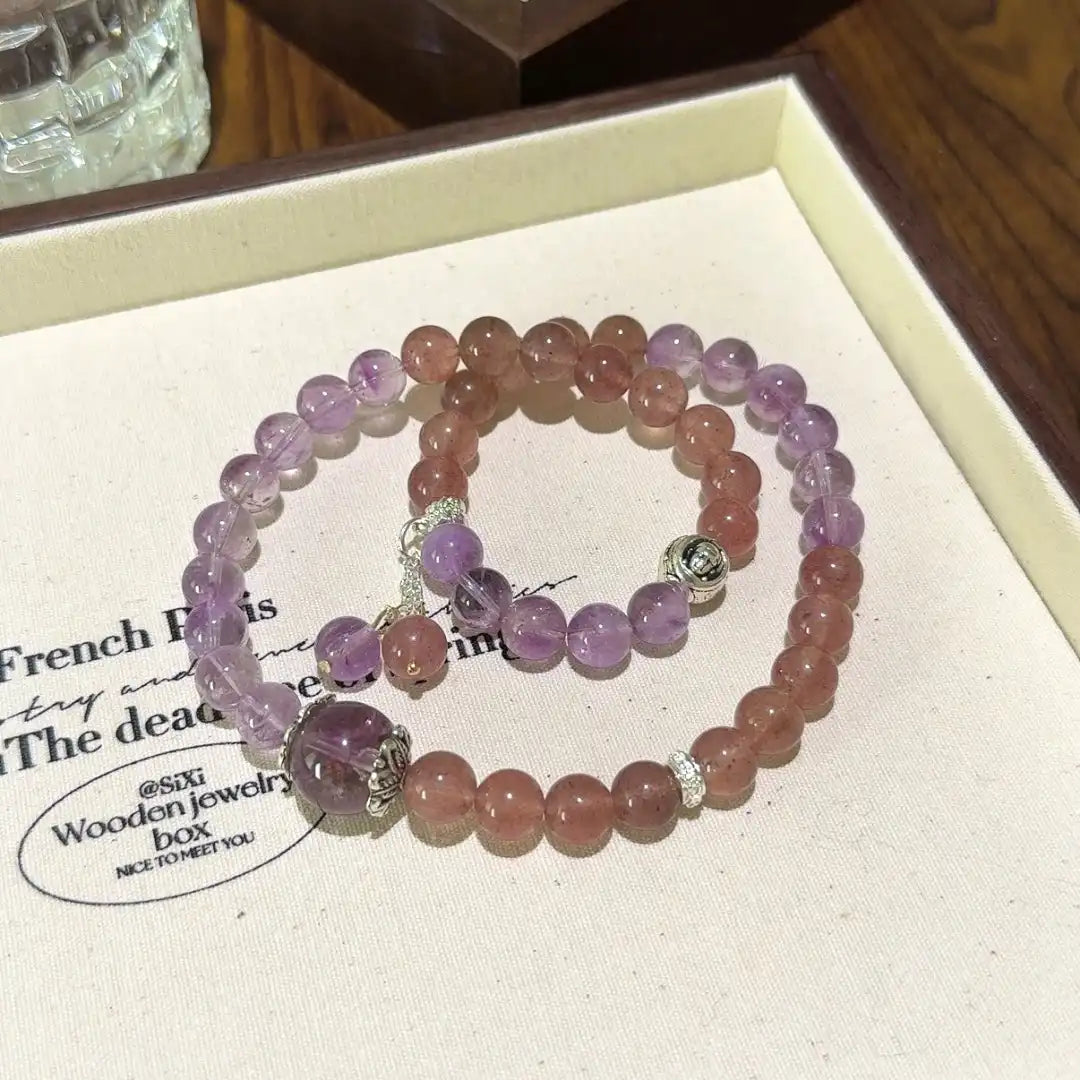 The sweet, radiant tones of strawberry quartz pair beautifully with the deep mystique of amethyst, creating an energy field that feels both soft and wise—playful sweetness wrapped in serene intuition.